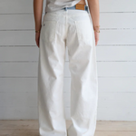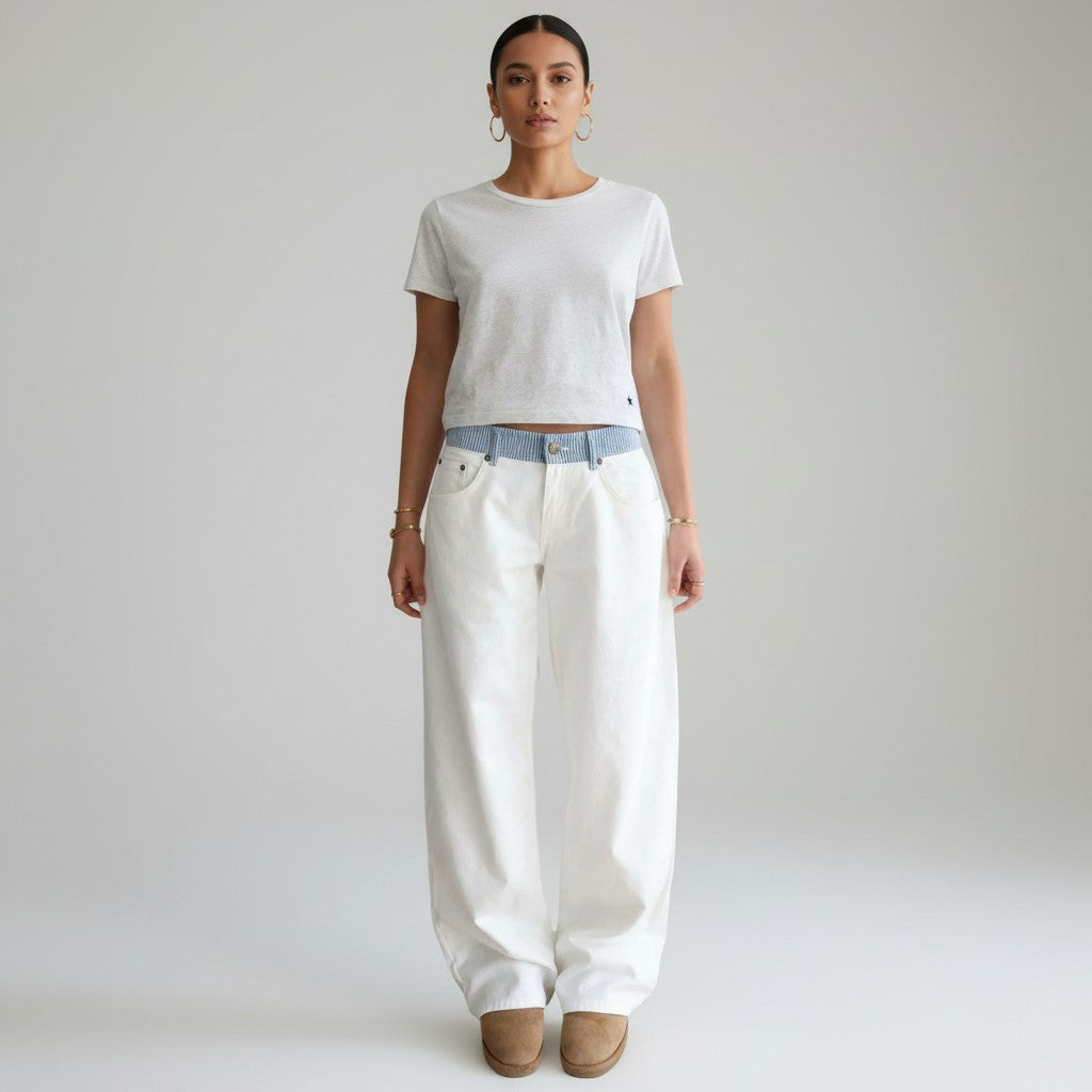 Deze offwhite relaxed fit jeans combineert een minimalistische uitstraling met een verrassend detail: een contrasterende blauw-wit gestreepte tailleband die de illusie van een extra laag creëert. De broek heeft een losse, rechtvallende pasvorm en valt soepel langs het lichaam – ideaal voor een relaxte, moderne look.