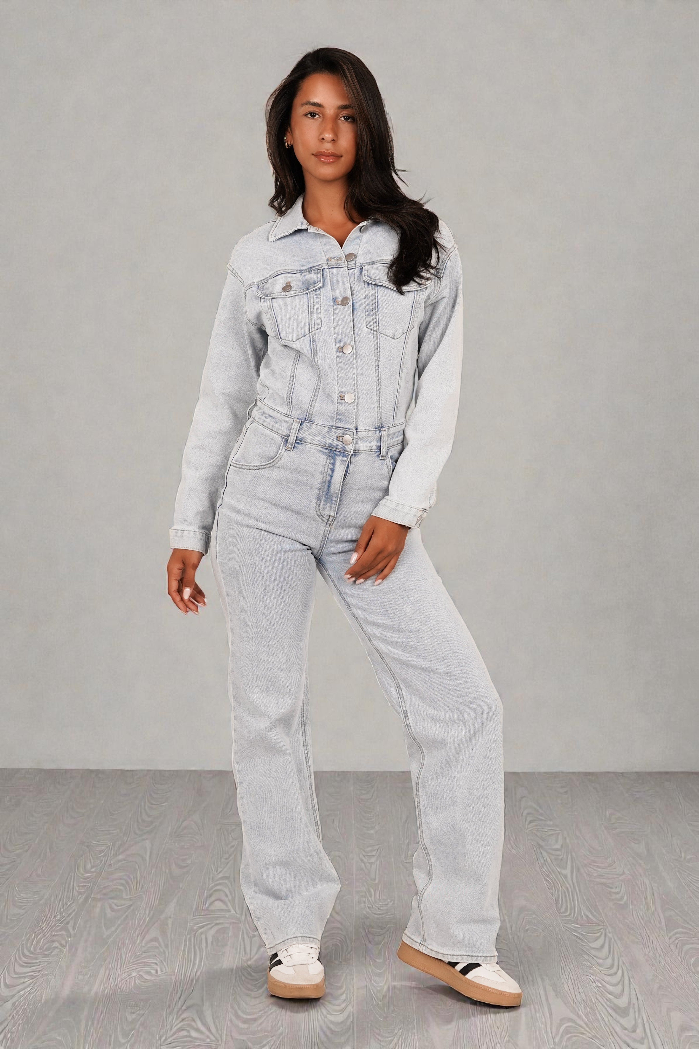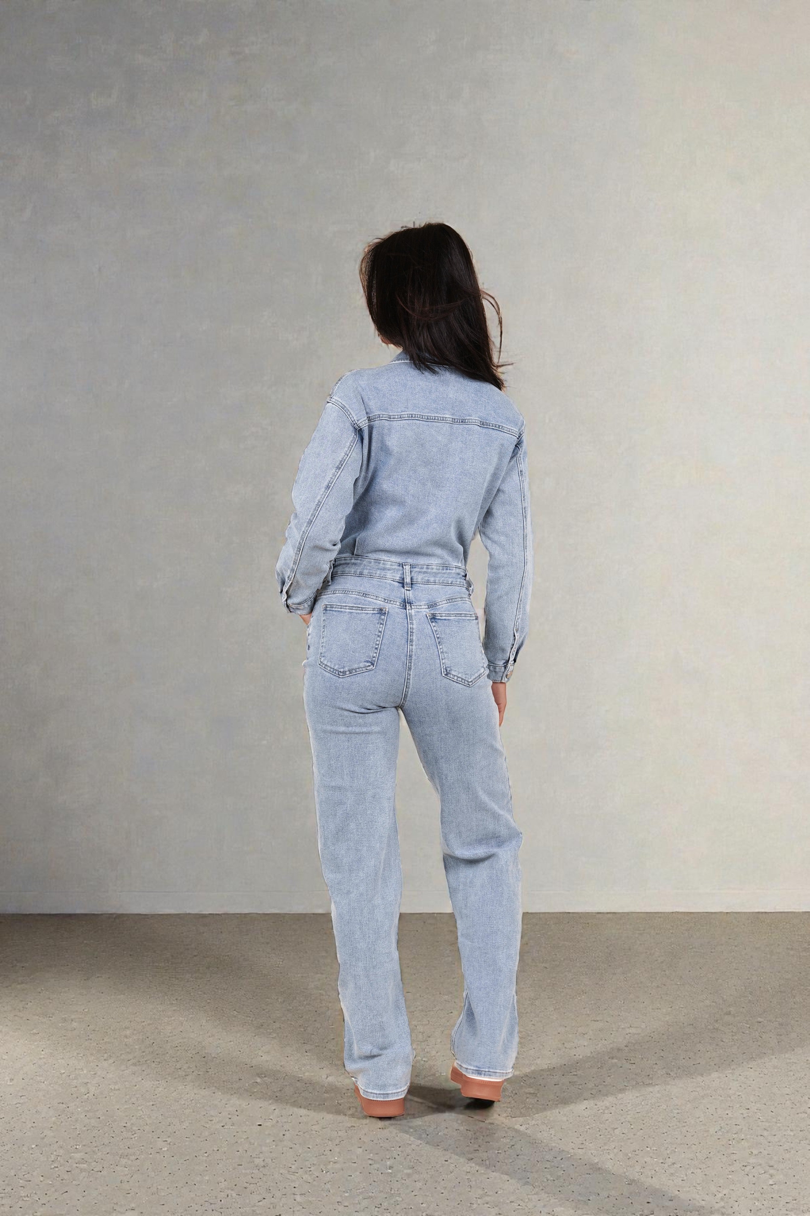 De jumpsuit is ontworpen met een klassieke kraag, metalen knoopsluiting en functionele borstzakken die de echte denimlook compleet maken. De gevormde taille en stevige denimstof creëren een soepel vallende maar toch gestructureerde fit. Ideaal voor dagelijks gebruik – van stadswandeling tot casual avondoutfit.