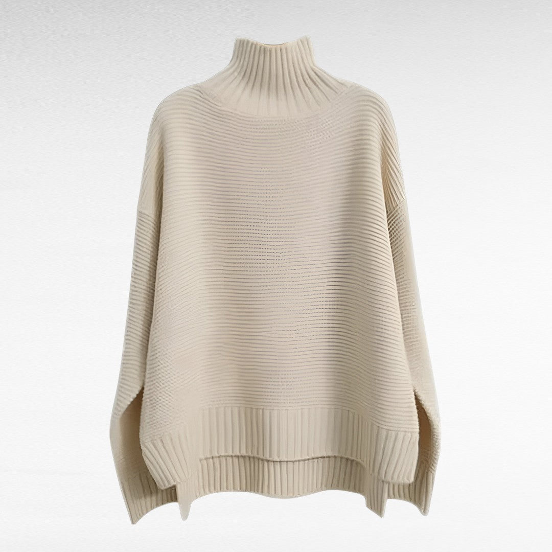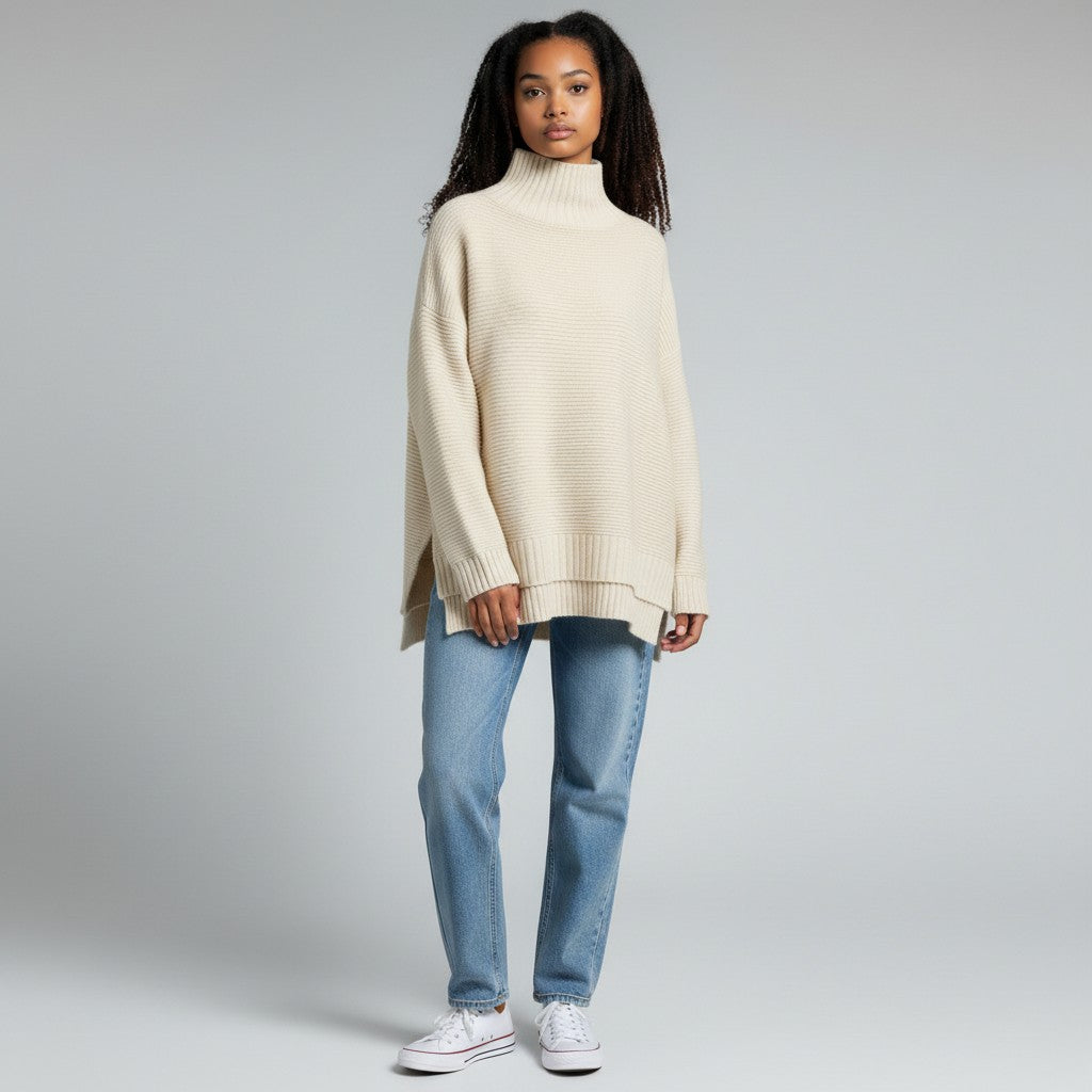 De horizontale ribstructuur geeft de trui een moderne, minimalistische uitstraling, terwijl de zijsplitten aan de zoom zorgen voor extra bewegingsvrijheid en een flatterend silhouet.