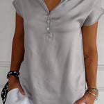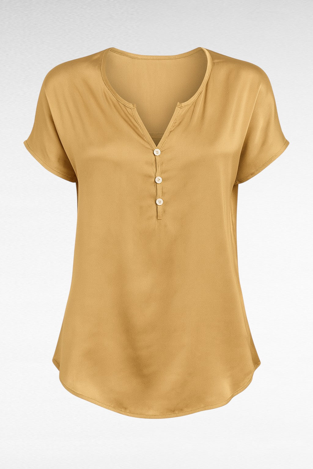 Voeg een vleugje luxe toe aan je garderobe met deze verfijnde satijnen blouse in een warme champagnekleur. De soepele stof valt zacht langs het lichaam en geeft een subtiele glans die perfect is voor zowel casual als chique gelegenheden. De diepe V-hals met sierlijke knoopsluiting en licht omgeslagen mouwtjes zorgen voor een nonchalante, maar toch stijlvolle uitstraling.