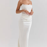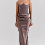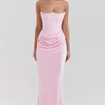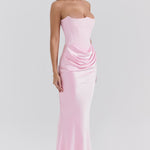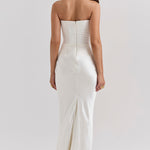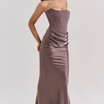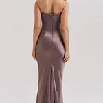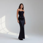 Stap binnen in tijdloze elegantie met deze verfijnde strapless avondjurk – een perfecte keuze voor gala's, bruiloften, diners en andere bijzondere gelegenheden. Deze jurk is ontworpen om het vrouwelijke silhouet prachtig te accentueren, met een strak aansluitend korset en een vloeiende rok van luxe satijn.