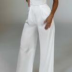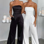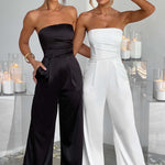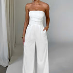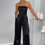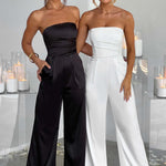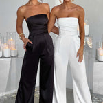 Ontdek de Elise Jumpsuit – een perfecte mix van elegantie, vrouwelijkheid en moderne allure. Deze strapless jumpsuit is gemaakt van luxe stretchsatijn dat prachtig om het lichaam valt. Het subtiele korsetdetail in het lijfje zorgt voor een mooie, gedefinieerde vorm, terwijl de zachte plooien en de wijde pijpen een verfijnde, tijdloze uitstraling creëren.