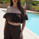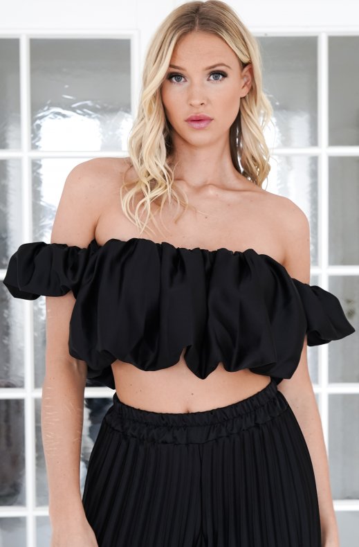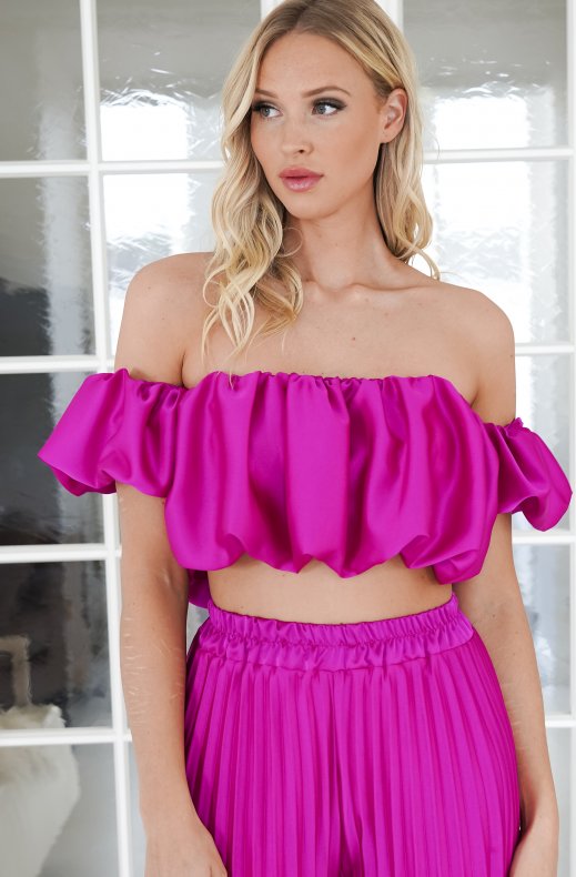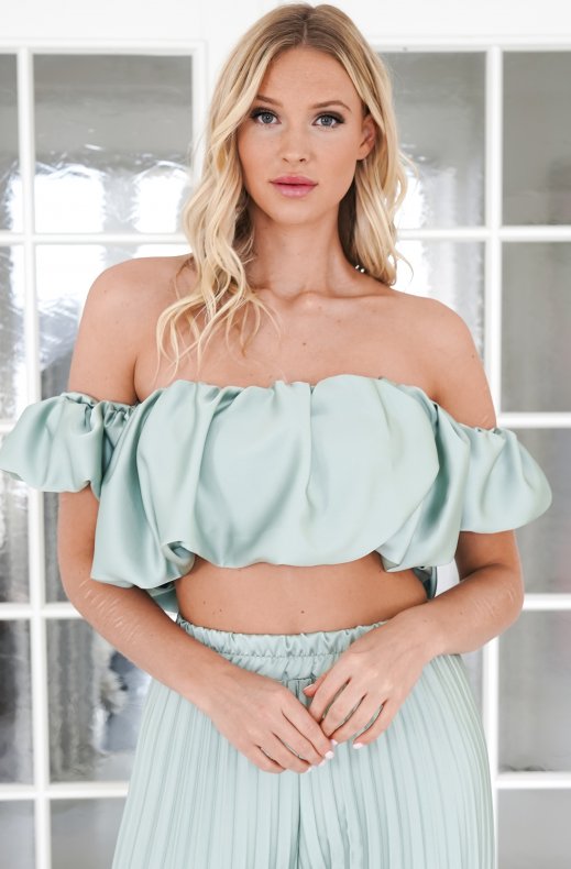 Mooie pasvorm – De cropped top met off-shoulder mouwen en de high-waist broek vormen samen een flatterende en vrouwelijke combinatie.